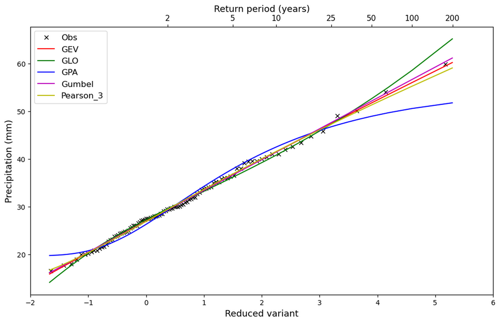 - Comprehensive Distribution Fitting: Supports a variety of distributions including Generalized Extreme Value, Generalized Logistic, Generalized Pareto, Gumbel, and Pearson III.